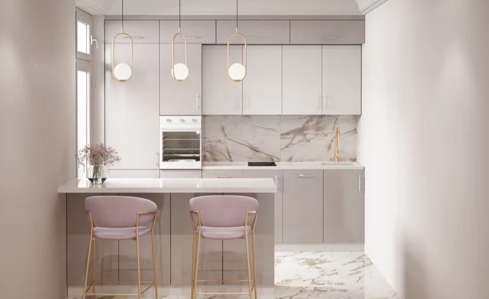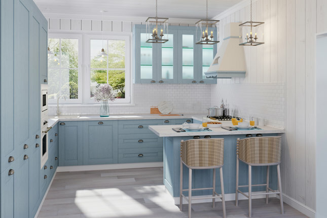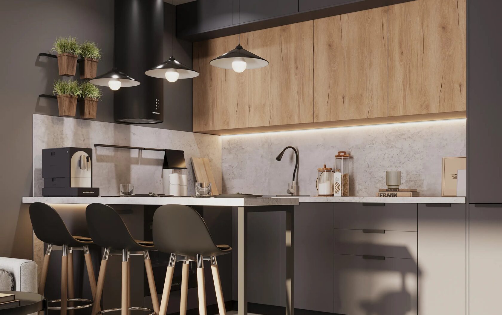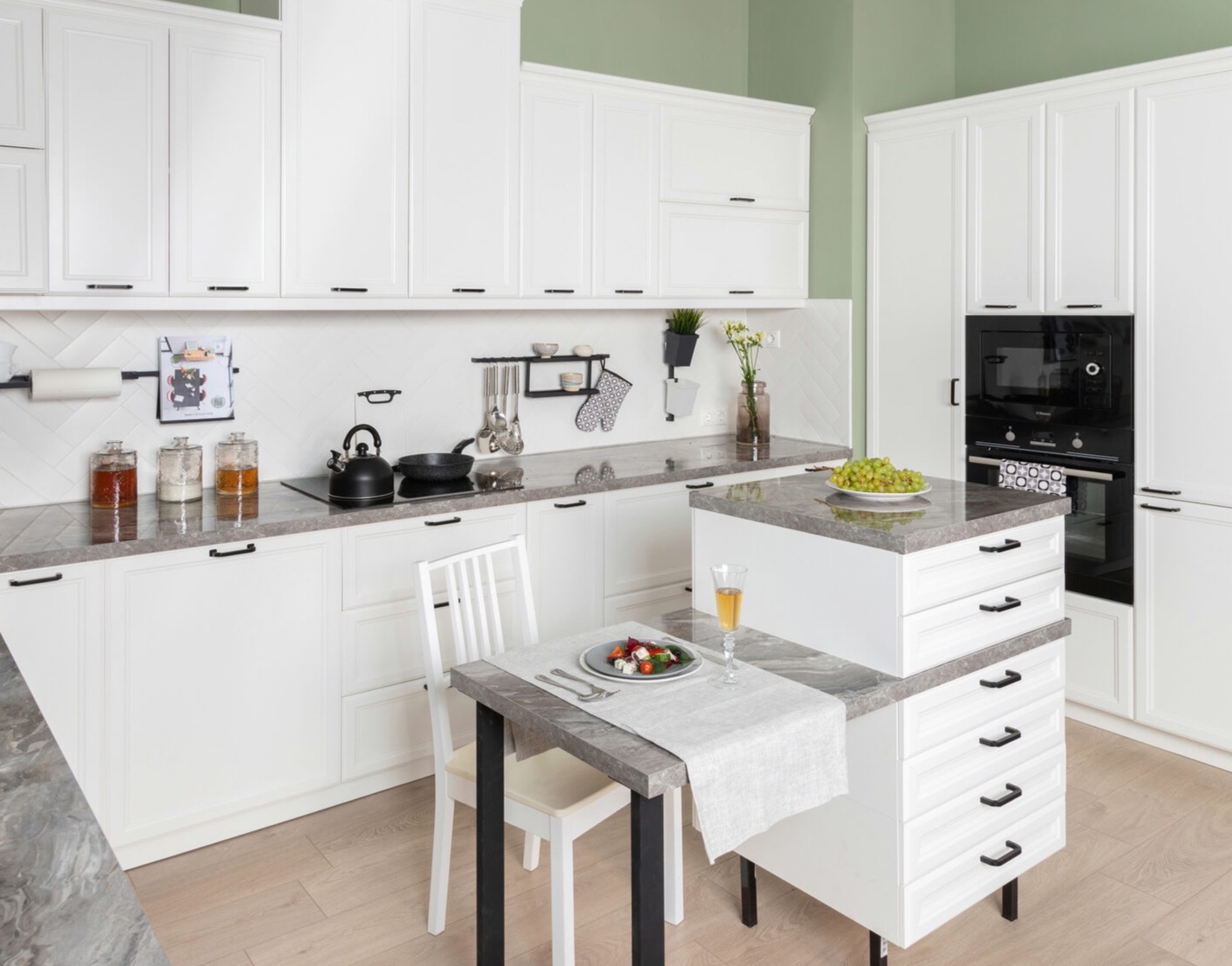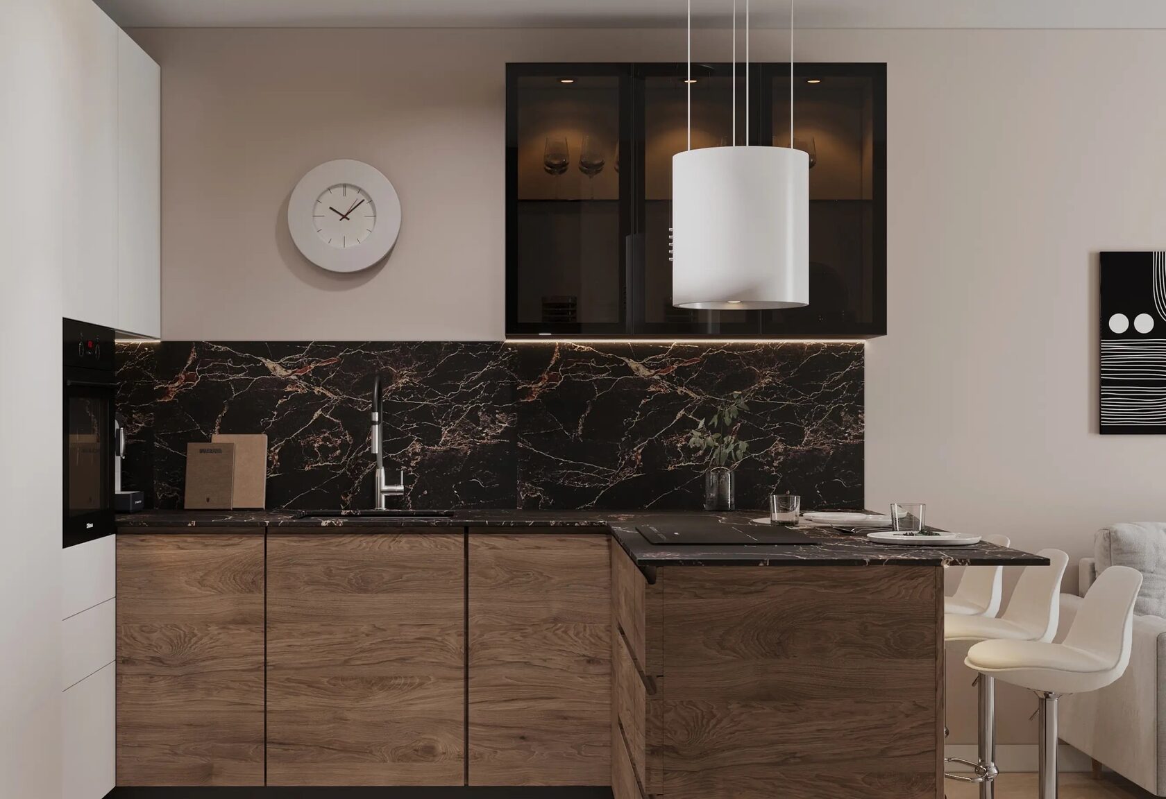 Отделите рабочую зону от обеденной минимум на 60-70 см, а лучше на 100 см: тогда вы обеспечите комфортное передвижение на кухне.